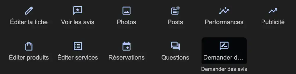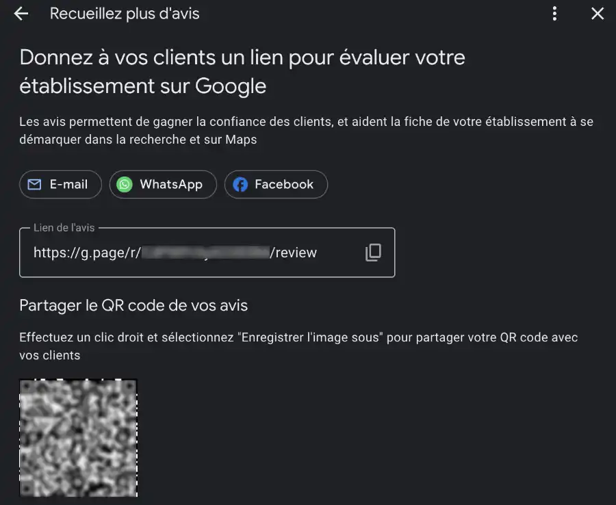 Recherchez le bouton « Obtenir plus d’avis » (parfois affiché comme « Partager le formulaire d’avis »). En cliquant dessus, Google génère automatiquement un lien unique pour votre entreprise.